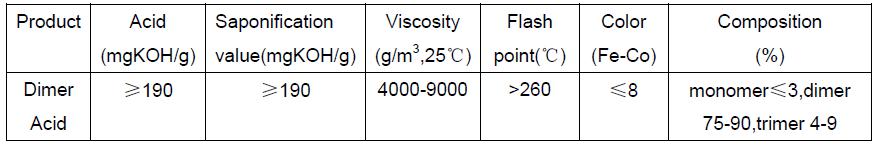 The polymer Fatty Acid is usually referred to Dimer Polymeric Fatty Acid, which is a mixture with complicated ingredient and is so named due to the two carboxyl groups contained in the main ingredient. It is inter-polymerized between non-saturated acids, such as Oleic Acid and Linoleic Acid. The Dimer Acid is featured with excellent thermal stability, and can keep mobility within a wide temperature range.